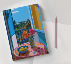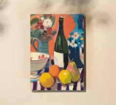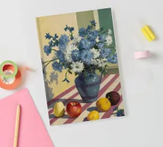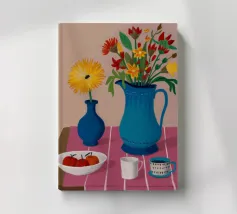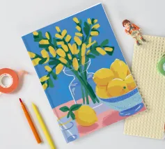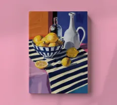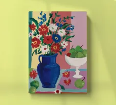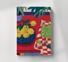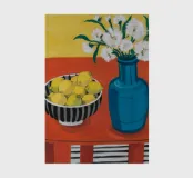 An inviting still life on a bright red table, featuring a bowl of lemons and a blue vase holding delicate white flowers. The warm yellow background enhances the cozy and vibrant atmosphere.