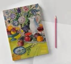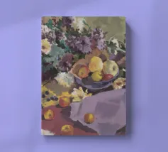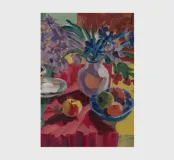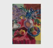 A lavish still life painting features a silver teapot, a cup of tea, a bowl of fruit including apples and berries, and a vibrant bouquet of flowers, all richly colored and textured, on a table.