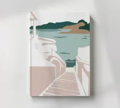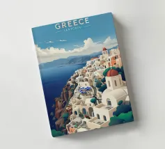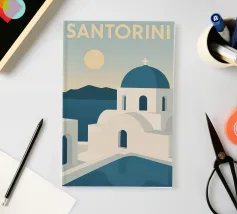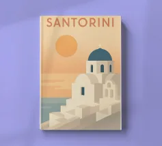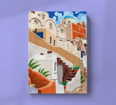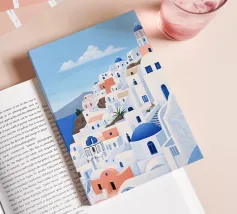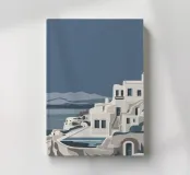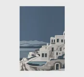 A minimalist depiction of the iconic whitewashed architecture of Santorini, Greece, under a calm, dusky sky, conveying a profound sense of peace, tranquility, and timeless beauty.
