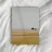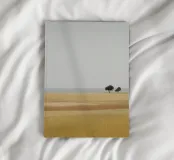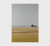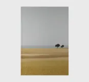 Minimalist artwork featuring a vast golden field stretching to the horizon with a calm ocean and a pair of distant trees under a soft, clear sky. Ideal for a tranquil and expansive feel.