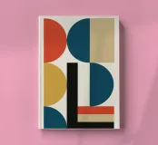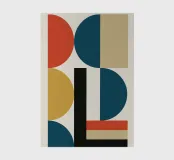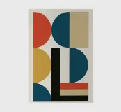 Clear poster in modern Bauhaus style. Geometric shapes in red, blue, gold and beige form a balanced composition on a light-coloured background. Inspired by classic design aesthetics - minimalist, powerful and timeless. Ideal for modern interiors.