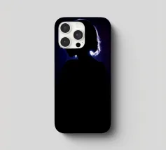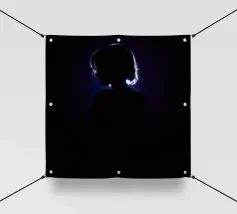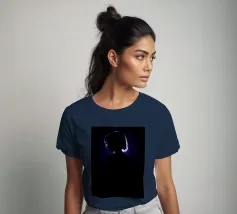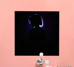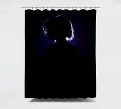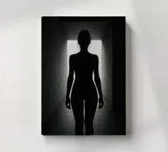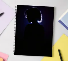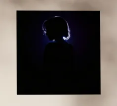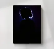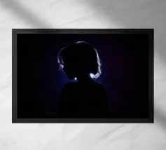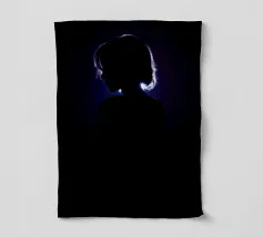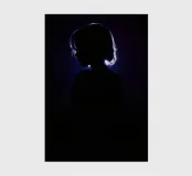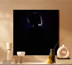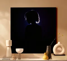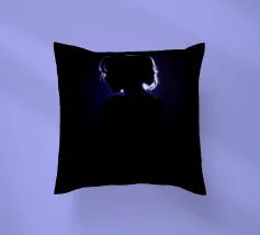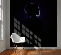 silhouette stands in front of a dark backdrop, illuminated by a gentle light source from behind, creating a soft glow around the hair. The atmosphere is calm