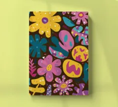 A simple and cheerful pattern of stylized daisies in various colors against a dark background creates a classic, beautiful, and timeless floral design.