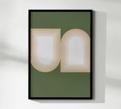 Simple Harmony This piece explores the quiet balance found in simple geometric forms and a restrained color palette. The composition centers on a warm, terracotta arch shape, suggesting a doorway or architectural threshold, which is partially overlapped by a grounding sage-green circle. A delicate horizontal line and a small grey dot add precision to the otherwise soft, organic shapes. Rendered in a modern, minimalist style, it creates a feeling of peaceful stillness and timeless equilibrium.
