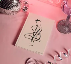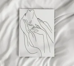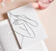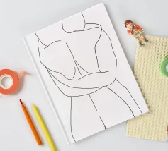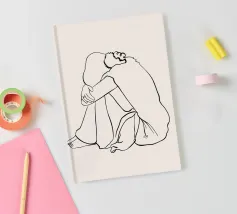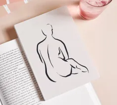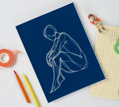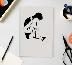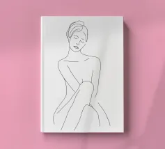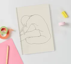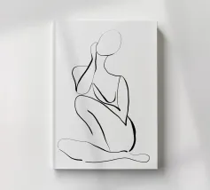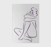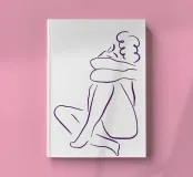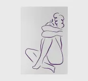 A simple line drawing depicts a seated person with curly hair, arms wrapped around their knees. The minimalist style uses smooth, flowing lines to convey a sense of calm and introspection.