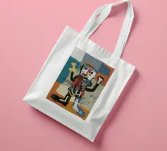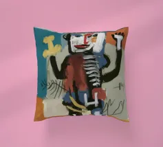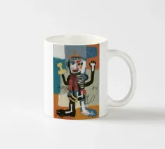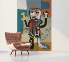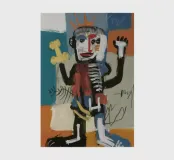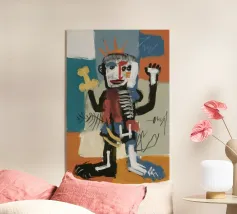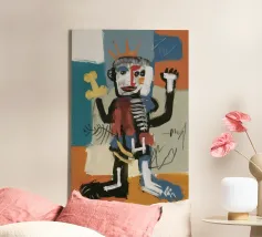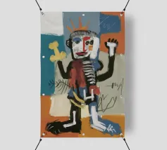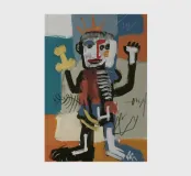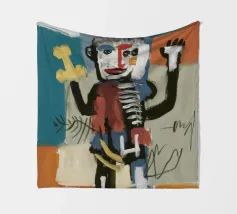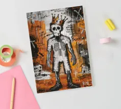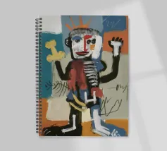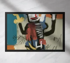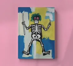 A skeleton figure in motion, holding a staff, marching forward. The background, filled with blue, white, and orange, reflects movement and determination.