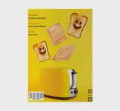 Slices of toasted bread with smiling faces float above a yellow toaster. The background features text about packaging, production, and mixing, emphasizing sustainability and energy savings.