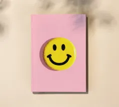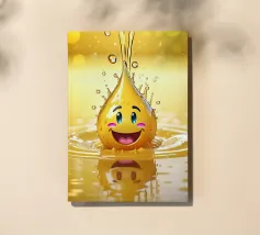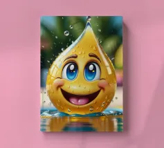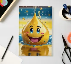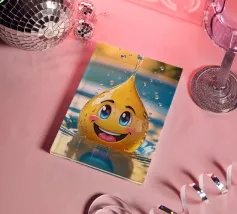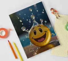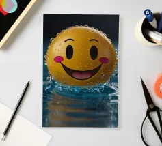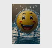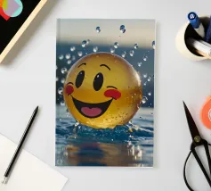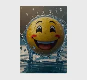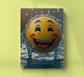 A cheerful yellow emoji with a wide grin makes a splash as it bounces off the water's surface, creating ripples and droplets all around it, radiating joy.