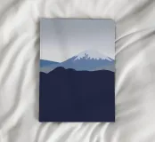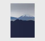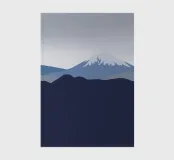 Layers of hills or mountains in various shades of blue create a sense of depth, leading up to a large, snow-capped peak in the background. The style is minimalist and uses a gradient of colors to convey the landscape's silhouette against a light sky.