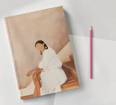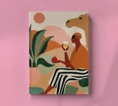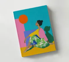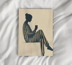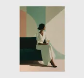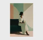 Blending mid-century tones and modern grace, this piece explores the intersection of shape and solitude. The soft color palette and bold geometry echo the woman’s tranquil presence, crafting a composition that feels like visual jazz—sophisticated and effortless.