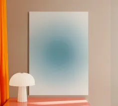 This tranquil abstract artwork features a soft, ethereal gradient in soothing shades of teal and muted blue, forming a subtle oval shape that fades gently into a pure white background. The smooth transition of color evokes a sense of calmness and expansiveness, reminiscent of a peaceful body of water or a serene aura. Its minimalist design promotes a feeling of quiet contemplation, ideal for modern and calming interiors. This premium digital poster boasts an impressive 7000x5000 pixels resolution at 300 dpi, ensuring exceptional clarity and vibrant detail for a truly stunning display.