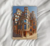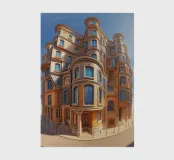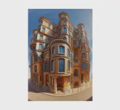 A surreal architectural structure with curved and distorted features, blending classic and modern styles, stands under a bright blue sky. The cobblestone street and soft sunlight enhance the whimsical, dreamlike atmosphere.