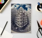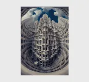 A surreal fisheye perspective showcasing towering futuristic gothic architecture with intricate details and symmetrical patterns, set against a vibrant blue sky with dramatic clouds. The image evokes modernity blended with classical design elements.