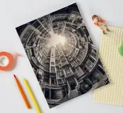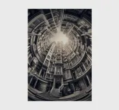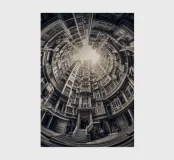 This image showcases a surreal architectural scene featuring concentric buildings in a circular arrangement. The monochrome tones add a vintage touch, with the sunlit center creating depth and an illusion of infinite height.