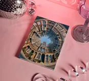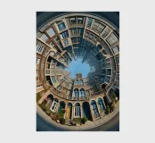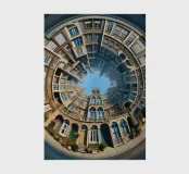 This image features a surreal, circular arrangement of brick buildings with arched doorways, intricate windows, and a bright blue sky at the center. The immersive design creates an optical illusion of endless architectural symmetry.