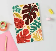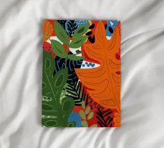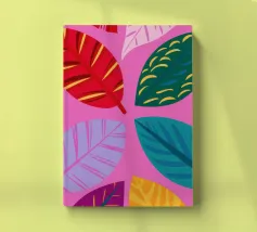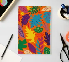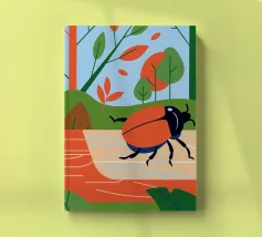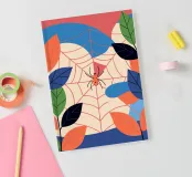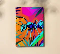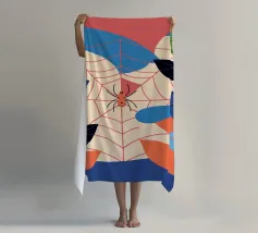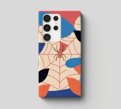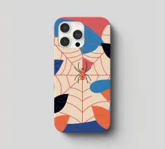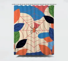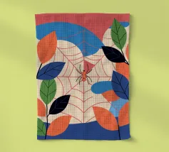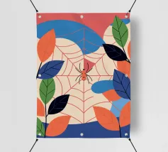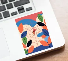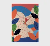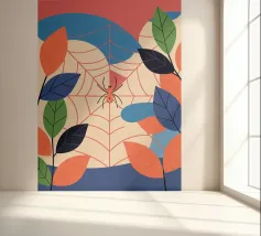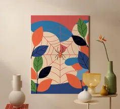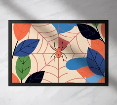 Enjoy a colorful nature illustration featuring a spider in its web surrounded by leaves. With vibrant colors and a unique design, this artwork will bring a touch of nature and artistic flair to your space.