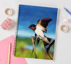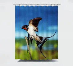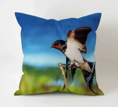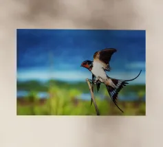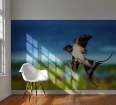 The swallow spreads its wings and soars in the blue sky, its long, pointed wings flapping rhythmically and gracefully like soft strokes of a painting. Its small body and graceful forked tail help it glide quickly in the air. Its flight is gentle and flexible, sometimes circling, sometimes swooping low, leaving a feeling of freedom and vitality in the vast sky.