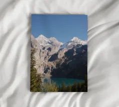 A crisp spring day at the shores of Lake Thun, showcasing the snow-covered peaks of the Bernese Alps. This peaceful landscape features calm water, a charming Swiss village, and majestic mountains under a clear blue sky. Captured with a Fujifilm camera in natural tones – ideal for art lovers, travelers, and alpine photography enthusiasts.