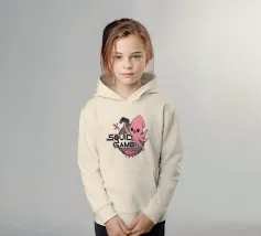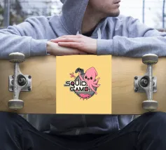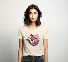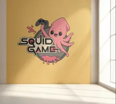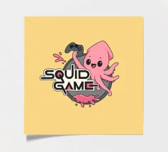 A cheerful pink squid holds a game controller while joyfully bursting through the Squid Game logo. This playful design flips the dark tone of the famous series into a kawaii gaming twist. Perfect for gamers, meme lovers, and fans of cute chaos with a pop culture edge.