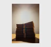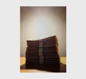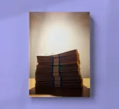 Multiple bundles of cash are neatly stacked on a wooden surface, illuminated by a warm light in a dimly lit environment, creating an atmosphere of wealth and possibility.