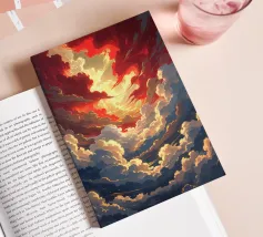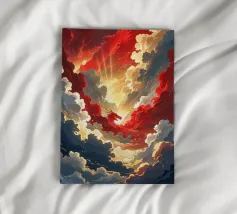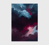Dark and light clouds intertwine in stunning hues of blue, red, and gray as dusk approaches. The swirling patterns evoke a sense of movement in the evening sky.