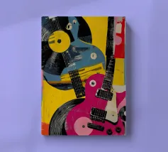A modern abstract painting featuring geometric shapes forming guitars, violins, and musical notes in a bold, colorful composition. The textured background and dynamic arrangement evoke a sense of rhythm and artistic expression.