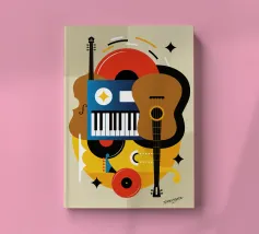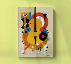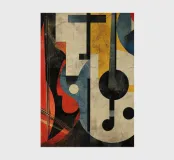 A modern abstract painting featuring geometric shapes forming guitars, violins, and musical notes in a bold, colorful composition. The textured background and dynamic arrangement evoke a sense of rhythm and artistic expression.