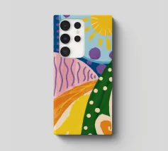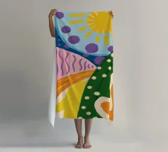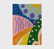 A dynamic abstract landscape featuring rolling hills and vibrant organic shapes under a radiating sunburst. The energetic brushstrokes and bright colors evoke a sense of joy and natural vitality.