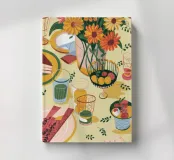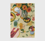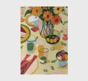 A still life painting of a table set with various dishes, glasses, and a vase of sunflowers.