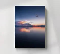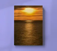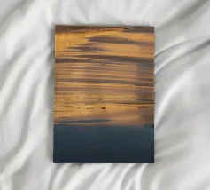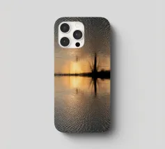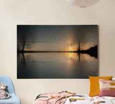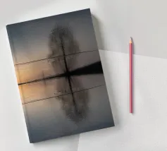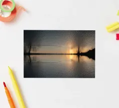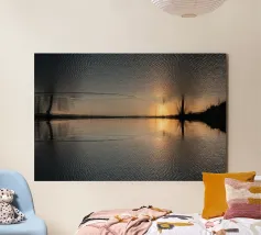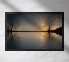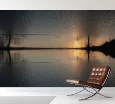 This symmetrical composition is dedicated to the relaxing ambience by the water, the mirrored image of nature and the magical colours at sunset in winter. Golden sunlight is reflected on the surface of the water, as are the dark silhouettes of the trees. Frozen areas as well as gentle movements of the water lend the reflection of nature an abstract effect.