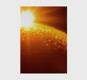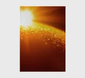At dawn, sunlight breaks through the horizon, casting a golden glow over a surface adorned with tiny shimmering droplets. The warm hues enhance the tranquil beauty of the morning.