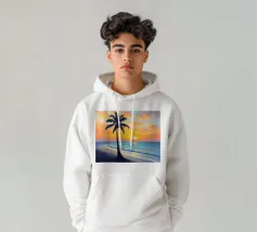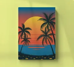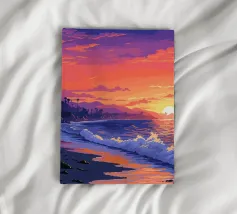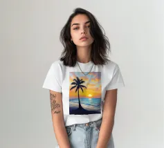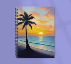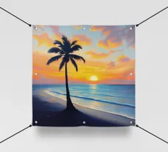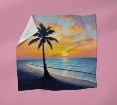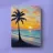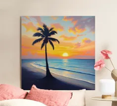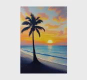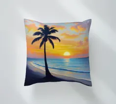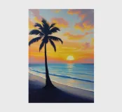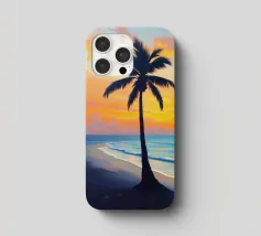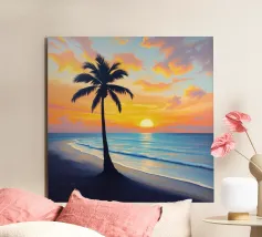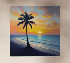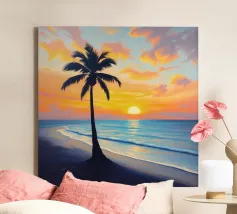 A serene beach at sunset features a silhouetted palm tree against a vibrant sky filled with hues of orange and purple. Gentle waves lap at the shore.