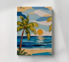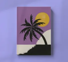 A serene beach at sunset features a silhouetted palm tree against a vibrant sky filled with hues of orange and purple. Gentle waves lap at the shore.