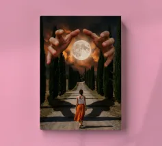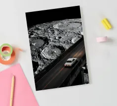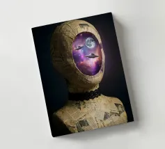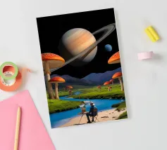 This surreal artwork blends a sunlit tropical beach with a breathtaking cosmic twist, featuring a massive planet rising above dramatic desert cliffs. A vintage-inspired couple stands at the shoreline, gazing toward an impossible yet dreamlike horizon where ocean, land, and space collide. The contrast of warm sand, turquoise water, and celestial blues creates a striking visual balance that evokes wonder, romance, and escapism. Perfect wall art for modern interiors, creative studios, or travel lovers, this design appeals to fans of surreal landscapes, retro aesthetics, fantasy art.