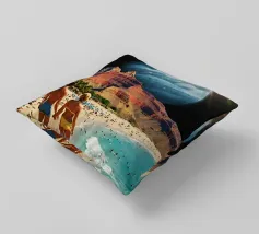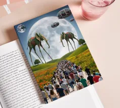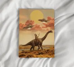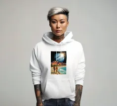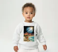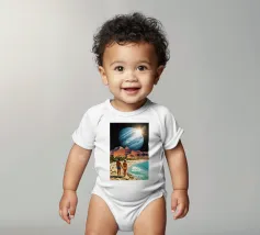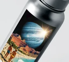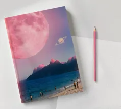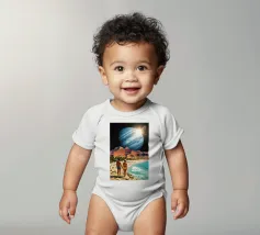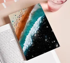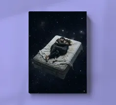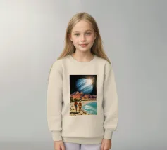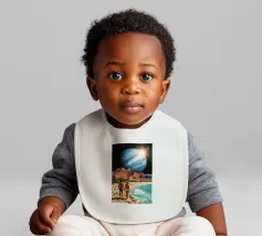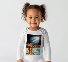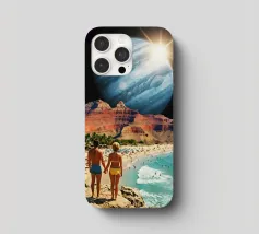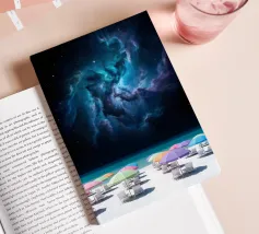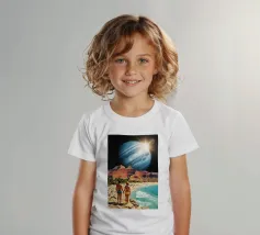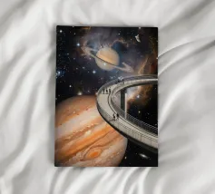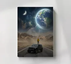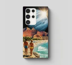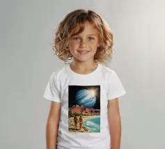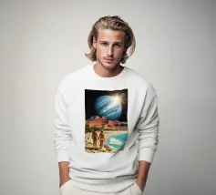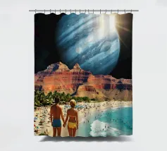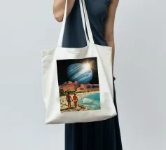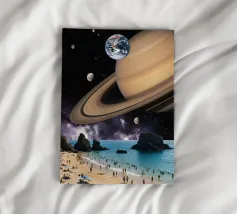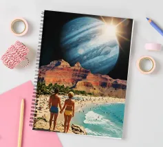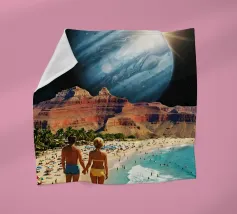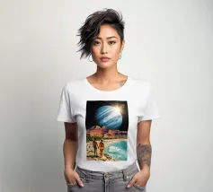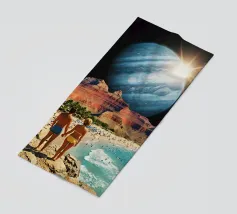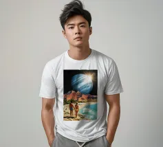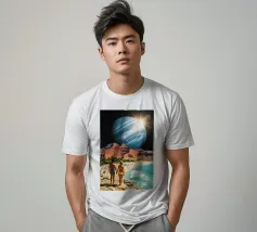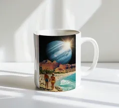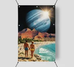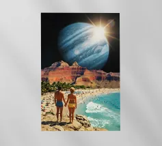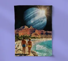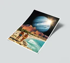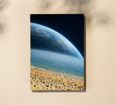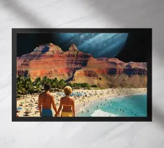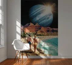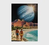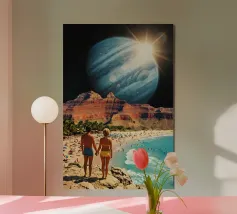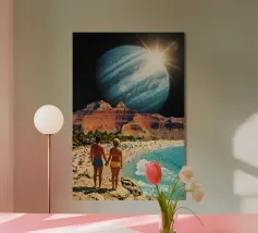 This surreal artwork blends a sunlit tropical beach with a breathtaking cosmic twist, featuring a massive planet rising above dramatic desert cliffs. A vintage-inspired couple stands at the shoreline, gazing toward an impossible yet dreamlike horizon where ocean, land, and space collide. The contrast of warm sand, turquoise water, and celestial blues creates a striking visual balance that evokes wonder, romance, and escapism. Perfect wall art for modern interiors, creative studios, or travel lovers, this design appeals to fans of surreal landscapes, retro aesthetics, fantasy art.