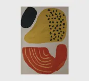 A minimalist abstract composition of balanced organic shapes in a palette of black, beige, and red, with a distinct textured feel.