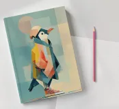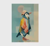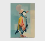 A charming geometric portrait of a young penguin dressed in colors of dawn and dusk — coral, teal, and sand. The playful abstraction captures both innocence and quiet confidence, balancing crisp shapes with soft painterly edges. A poetic artwork that brings warmth, humor, and modern elegance to any room.