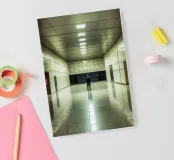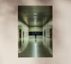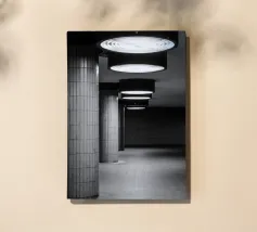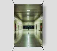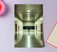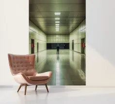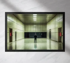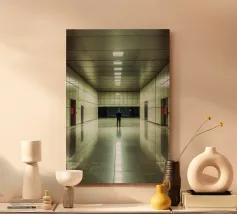 Immerse yourself in a captivating architectural universe where minimalism meets a cinematic atmosphere. This composition plays on symmetries and reflections to evoke solitude and introspection, a perfect masterpiece to enhance your interior with a modern touch.