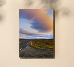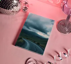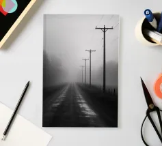 A haunting capture of a deserted road bending into the unknown. Wind lifts dust and mist across the asphalt, while distant terraced hills fade under a cloudy sky. A faint shaft of light breaks through, illuminating the swirling haze. The scene carries a cinematic, almost post-apocalyptic stillness—where time feels suspended and the road itself becomes the main character. Perfect for lovers of moody landscapes, minimalism, and atmospheric photography.