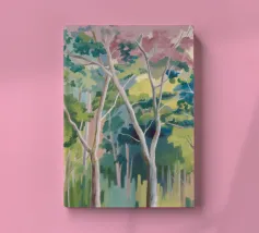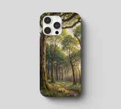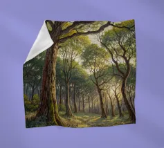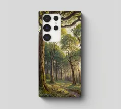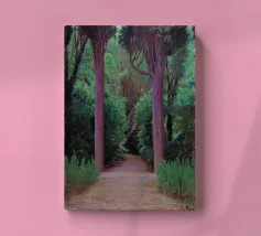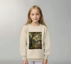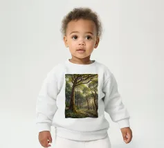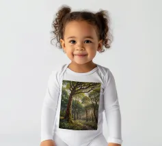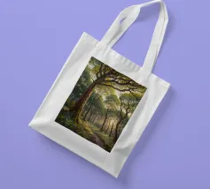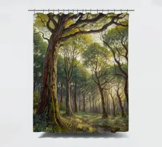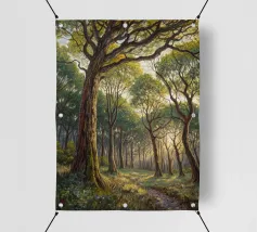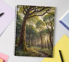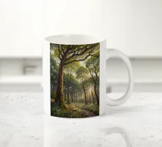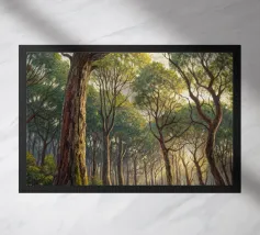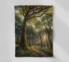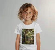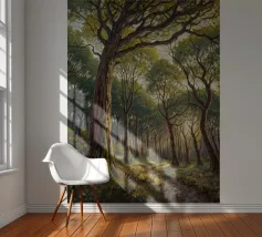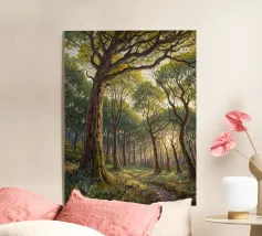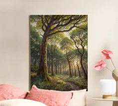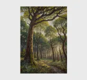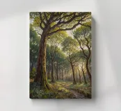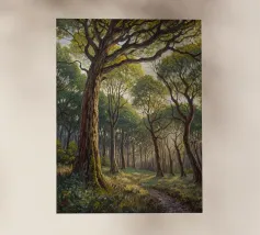 This painting depicts a serene and mystical forest scene, with a sun-dappled path leading toward a brilliant, glowing light in the distance. The towering, ancient trees create a natural cathedral, their leaves a rich tapestry of greens, while soft light filters through the canopy, illuminating the forest floor. The atmosphere is one of hope and tranquility, inviting the viewer to follow the light and discover what lies ahead. This artwork captures the magic and quiet majesty of nature, blending realism with a touch of fantasy to evoke a sense of wonder and peaceful exploration.