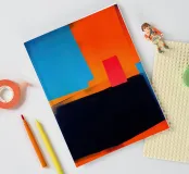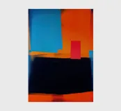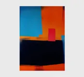 This powerful abstract composition combines large areas of colour in bright blue, intense orange and deep black to create a balanced tension. The small red rectangle acts as a visual anchor point between the monumental blocks of colour. The work is in the tradition of Mark Rothko and Helen Frankenthaler, while the clear geometry is reminiscent of Mondrian. The soft brushstrokes and colour transitions lend organic vitality to the strict composition. This fusion of colour-field painting and hard-edge abstraction creates contemplative power for the room.