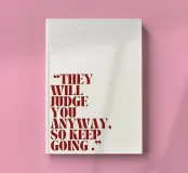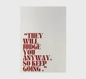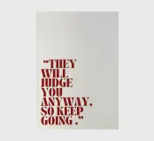 "The quote "THEY WILL JUDGE YOU ANYWAY, SO KEEP GOING." stacked in multiple lines, rendered in a bold, serif font with a deep red hue against a soft, offwhite background, conveying a message of resilience and perseverance in the face of criticism.",