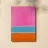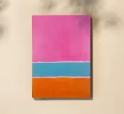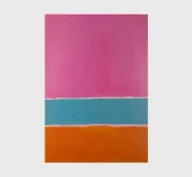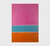 Large-format, minimalist painting with simple shapes and lines in pink, turquoise and amber. Three layers: a pink surface at the top, two thin turquoise stripes in the middle, a broad amber-coloured line at the bottom - radiates calm and serenity.