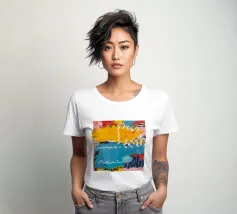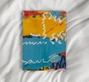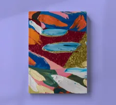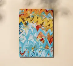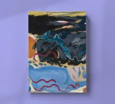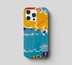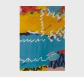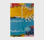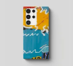 An abstract representation of flowing water or tidal movements, with broad strokes of blue, yellow, white, and red, creating a sense of harmonious yet dynamic aquatic motion.