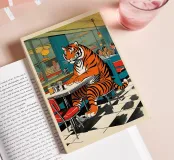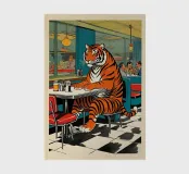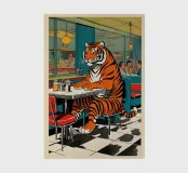 Tiger Diner - Retro pop art poster with tiger in a café A tiger sits calmly in an American diner - strong, surreal and charming at the same time. The motif plays with contrasts between wilderness and everyday life, retro and modern. The rich colours, 60s flair and subtle humour make "Tiger Diner" a real statement piece. Perfect for design lovers who appreciate art with character and a wink.