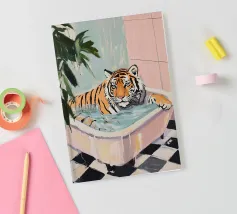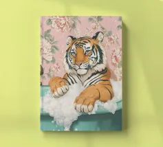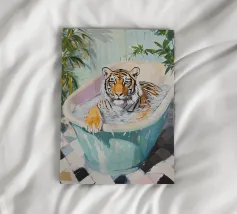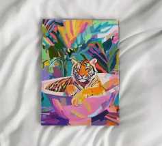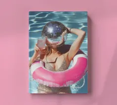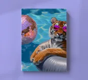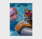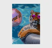 Bring the ultimate summer party to your walls with our "Tiger Disco Pool Party" poster. This vibrant and playful artwork features a cool tiger lounging in a pool on an inflatable ring, sporting stylish pink sunglasses, with a large, shimmering disco ball floating nearby. The dynamic blues of the water, the bold orange of the tiger, and the reflective pinks of the disco ball create a lively and unique pop art aesthetic. Perfect for adding personality and a sense of fun to any modern interior or entertainment space. Our digital art is meticulously crafted at 7000x5000 pixels resolution with 300