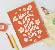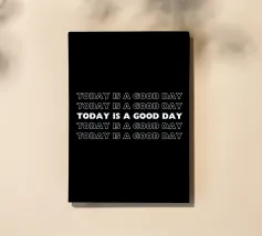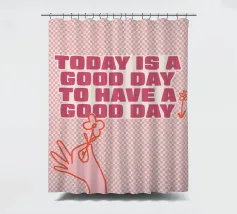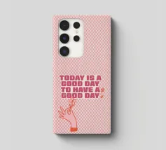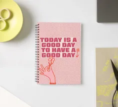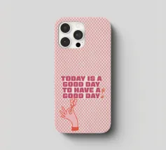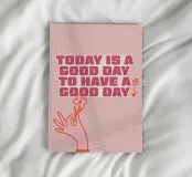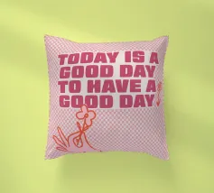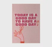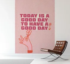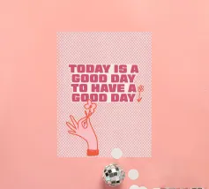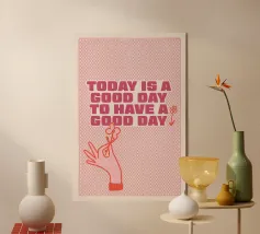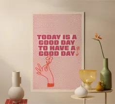 Inspirational art print with the saying "Today is a good day to have a good day" in bold retro-style typography. The design is set against a pink and cream coloured background with a minimalist illustration of a hand holding a small flower. The combination of uplifting text and cheerful colours makes this print perfect for brightening up any room and adding positivity and motivation to home or office décor.
