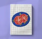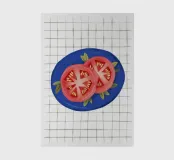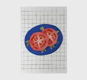 In this striking minimalist study, slices of bright red tomato are precisely arranged on a plate against a white grid background. The composition is a graphic play on shape, color, and pattern, finding beauty in simplicity and geometric precision.
