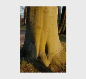 A tree at sunset. On a quiet winter evening, the trunk of a tree glows in golden-brown and green colours. Warm sunlight illuminates the dormant nature in the cold season. This detail shot is dedicated to the timeless elegance of old trees and the annual change in nature.
