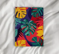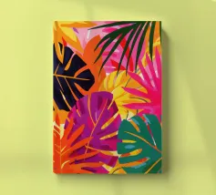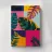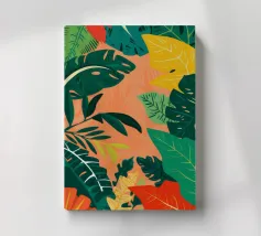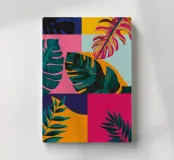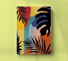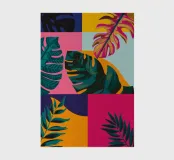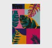 A sophisticated composition combines blocks of tropical leaf patterns with solid color fields and geometric shapes. The patchwork design in shades of blue, pink, and green creates a balanced and stylish piece that is both modern and natural.